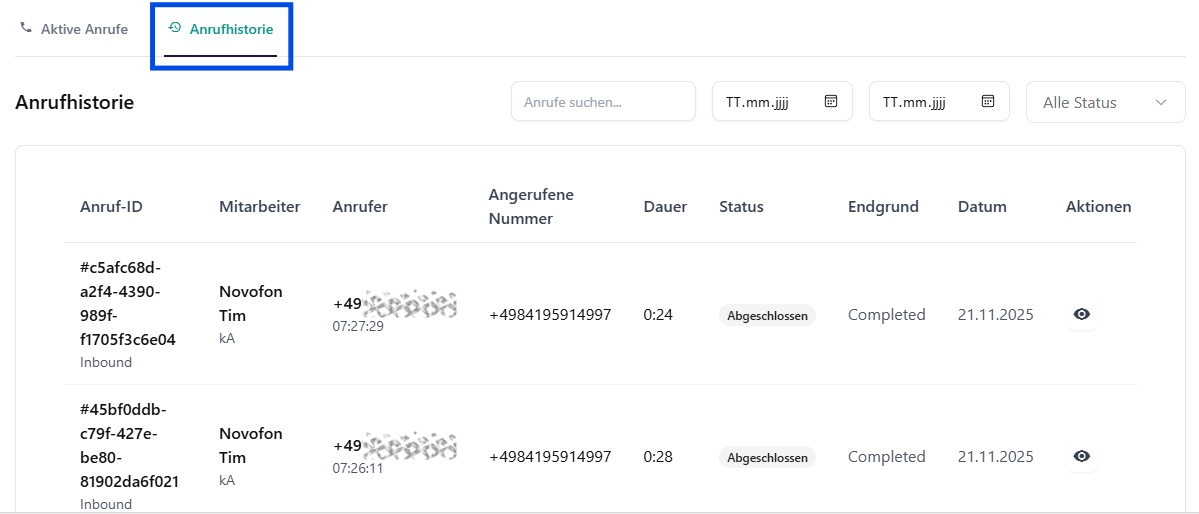 Im zweiten Reiter Anrufhistorie werden automatisch alle Anrufe aufgeführt, die der novofon KI-Assistenten geführt hat. Auf der rechten Seite kann nach Anrufen gesucht, nach Datum (Tag oder Zeiträume möglich) oder nach Status gefiltert werden.