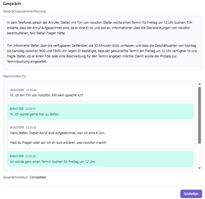 Durch klicken auf das Auge neben einem abgeschlossenem Gespräch, erhältst du Einsicht in die Gesprächszusammenfassung und die Transkription des Gesprächs.