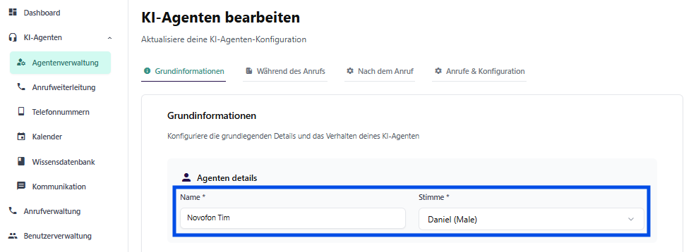 Die Sprache des KI-Agenten muss bei novofon nicht ausgewählt werden, diese erkennt der KI-Agent automatisch anhand des Prompts und der Sprache des Anrufers.