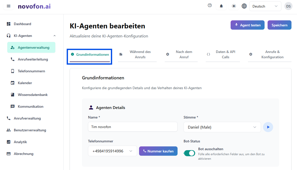 novofon-Tipp: benutze den Button “Agent testen”, um direkt im Browser deine Einstellungen zu testen.